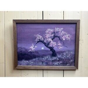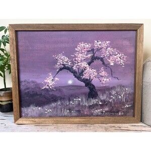 Vintage Signed Framed Oil Painting Cherry Blossom Tree At Dusk W/Moon Is Rising