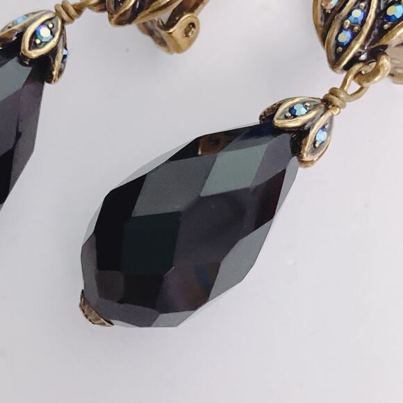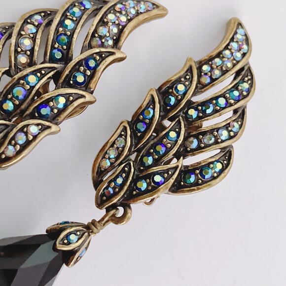 Vintage Signed Heidi Daus Angel Wings Crystal Clip-On Earrings Black Glass Drop