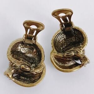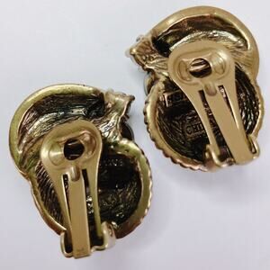 Features: Signed clip-on earrings; domed pavé crystal tops; baguette rhinestone arcs; dark faux pearl centers; warm gold tone finish; sculptural Art Deco fan motif