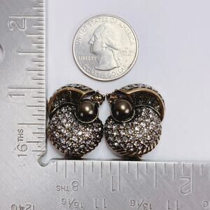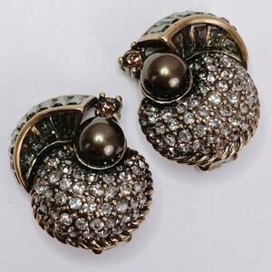 The architectural symmetry and radiant pavé crystal domes of these signed Heidi Daus clip-on earrings evoke the glamour of vintage Art Deco design. Dark faux Tahitian pearls and smoky baguette stones create a sophisticated contrast that catches light with quiet opulence, blending sculptural form with evening-ready sparkle.