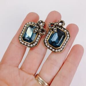 Vintage Signed Heidi Daus Blue Glass Bow Clip On Earrings Rhinestone Collectible