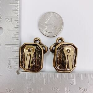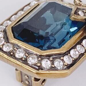 Features: Clip-on design; emerald-cut sapphire-blue glass stones; pavé crystal bows; crystal halo border; antiqued gold tone finish; signed on reverse