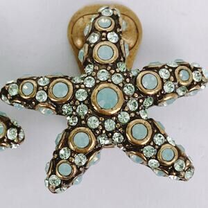 Features: Signed designer piece; starfish motif; pavé rhinestone accents; antiqued gold tone finish; clip-on backs; collectible seaside design