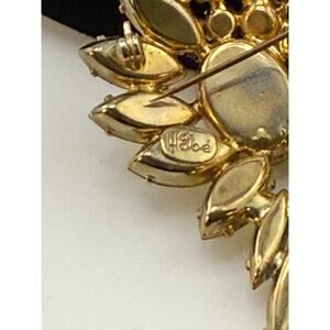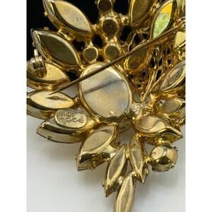 Vintage Hobe brooch produced in the 1960s. This unique design feature elaborate, hand-crafted leaves and flowers, and has a large cabochon amber placed offset to the curling filigree leaves. The jewelry from this period was all made in sterling silver and this one is gold plated. Originally sold in up-scale department stores and boutiques, Hobe jewelry was marketed under the slogan “Jewels of Legendary Splendor”. Stars of the stage and screen wore these creations. This brooch features multiple colors of yellow and green. It measures 2 inches by 2.5 inches and weighs 20.7g. A lovely Rare piece.