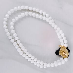 Features: Double strand of white beads; large black molded rose centerpiece; gold-tone leaf accents; clear rhinestone accent in teardrop bezel setting; fold-over clasp closure