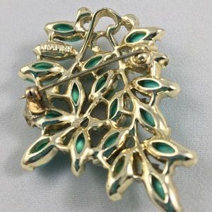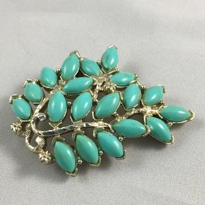 This signed vintage brooch by Kramer features faux turquoise cabochon stones. It's a elegant piece that is in great condition. Has no missing stones & is in good working condition. It measures approximately 2" long and just over 1 1/2" wide.