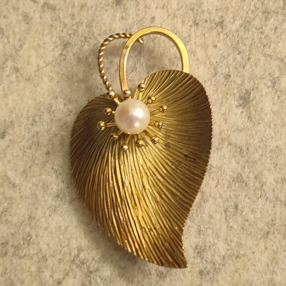 Vintage Signed Krementz 14k Gold Overlay Lg Leaf Pearl Brooch