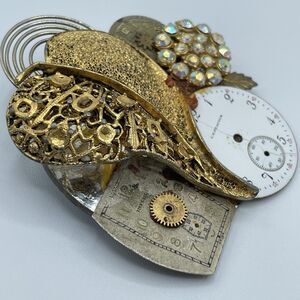 Vintage Signed LC 94 Steampunk Leaf Clock Statement Brooch Pin Rhinestones Gold