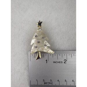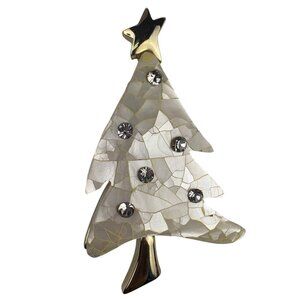 Vintage Signed LC Christmas Tree Brooch Mother Of Pearl Gold Tone Rhinestones Pi