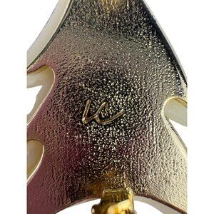 This Vintage Signed LC Christmas Tree Brooch is a cherished representation of mid-century craftsmanship. The intricate gold-tone metal base provides a radiant foundation for a lovely design inspired by holiday spirit. The shimmering mother-of-pearl inlay, arranged in a delicate mosaic pattern, brings out a luxurious sheen, enhanced by radiant rhinestones scattered to resemble ornaments. Crowned with a gold-tone star at the top, the tree exudes elegance, offering a festive yet timeless aesthetic. The pin features a secure clasp for easy wearability and bears the engraved "LC" signature on the back, a testament to its authenticity and quality. Measuring approximately 2 inches in height, this brooch makes a subtle yet vivid statement of classic holiday cheer. A perfect collectible or gift for lovers of vintage jewelry, this piece gracefully marries art and functionality in its design.