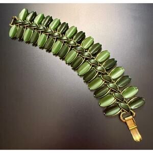 This is a vintage 1950’s signed Lisner gold tone Christmas green lucite bracelet. The colorful light & dark green lucite stones surrounded by the gold tone metal outline gives is dazzling. It's in excellent vintage condition with very, very small minor scratches on the clasp (nothing noticeable to the eye). It measures 7.5" in length and 1.6" in width.