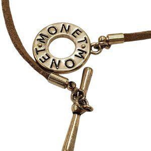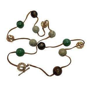 Vintage Signed Monet Set Necklace 38" Earrings 2" Green Bead Gold Tone Suede. Elegant design with green beads and gold-tone accents for a timeless look. Toggle Clasp,