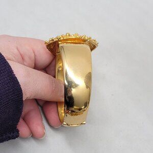 Modernist goldtone and black resin hinged cuff bracelet. Marked "NAPIER©." Measures: 1 1/2 inches tall by 2 1/2 inches wide by 2 3/8 inches deep. Interior circumference is about 7 inches. Condition: Very good; minor scuffing. An identical bracelet was featured in a 1973 Napier advertisement.