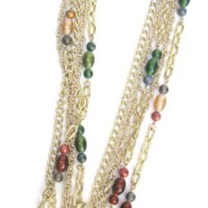 This wonderful vintage necklace Designed by Parma is from the 1980's is in excellent condition. It is 28" in length with a 3" extender. Multi-gold-tone chains feature Italian glass beads flecked with gold dust. Signed Parma on a tab at the necklace hook.
