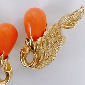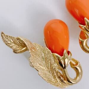The vivid orange cabochons capture the playful energy of mid-century design, set against textured gold tone leaves that lend refinement. These earrings carry the warmth and optimism of their era, turning a simple accent into a conversation piece.