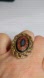 This Classy Vintage Sarah Coventry Old Vienna Galls Adjustable Gold Tone Ring features a red, blue, and black painted glass cabochon at its center, accented with 14k gold paint. Each layer of color is meticulously applied and fired in a kiln before the next is added. These glass cabochons were made in West Germany and imported for Sarah Coventry. This ring is currently set to a size 7 but can be adjusted 1/8  up or down. Circa 1965-1970's.