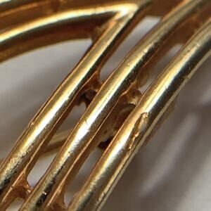 A sleek mid-century Trifari brooch with openwork curves and brushed gold-tone finish—timeless and easy to pair with both vintage and modern looks.