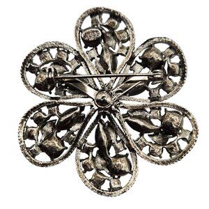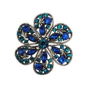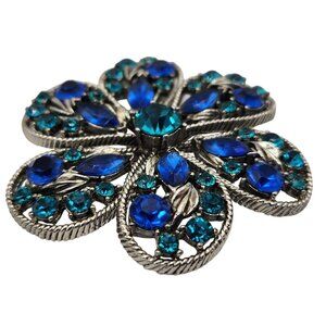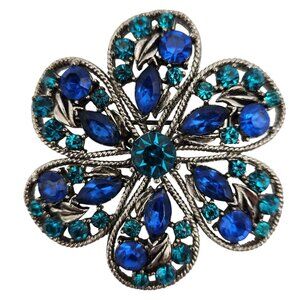 Dazzling 1950s WEISS blue and green rhinestone flower brooch set in silver-tone metal. The intricate openwork petals feature brilliant faceted stones in oceanic hues, framed by delicate leaf details. This design perfectly captures the glamorous sparkle and fine craftsmanship of mid-century Weiss creations.