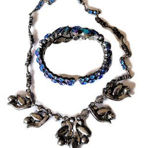 Vintage Signed Weiss Blue Rhinestone Necklace & Hinged Cuff Bracelet Jew…