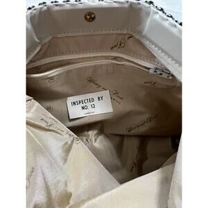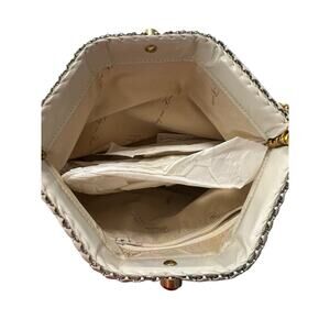 Description: Beautiful Vintage Whiting and Davis cream enameled purse with gold tone chain and door knocker style accent. Inside has a zippered pocket with Whiting and Davis signature lining. Pull opening.