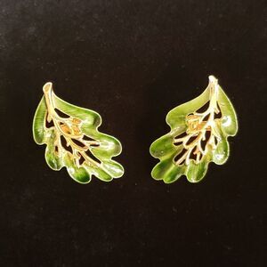 Vintage Signed Sarah Coventry Goldtone and Green Resin Leaf Clip Earrin…