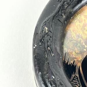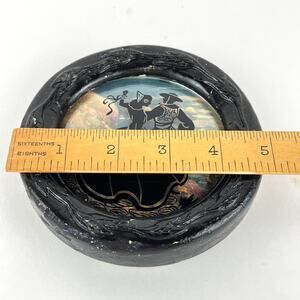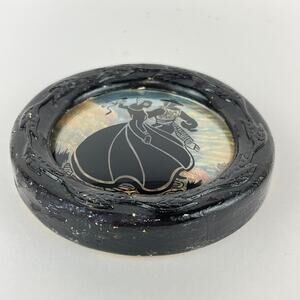 Unique vintage framed silhouette of couple flamenco dancing. Glass is convex with a painted black chalk frame (paint is chipping). Measures 5" round.