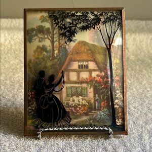 Vintage Silhouette Green and Black Cottage Painting Framed in Glass
