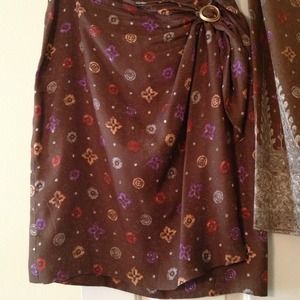 Beautiful brown silk wrap skirt with matching wrap/scarf. Print includes shades of cream, peach, terra cotta and purple.