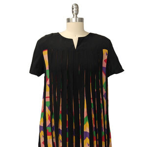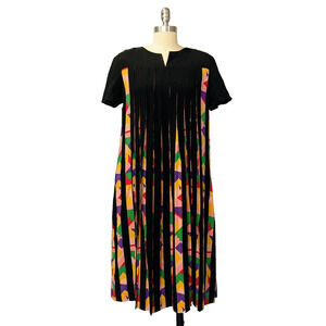 Amazing vintage Rue de Soi 100% silk pleated short sleeve midi dress with geometric multicolor stripes "hidden" in the pleats. Super unique and fun dress with excellent drape. Pullover, button and snap closure, side pockets. Light shoulder pads which can be removed.In gently preowned condition, no flaws noted. Measurements are approximate, lying flat.