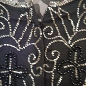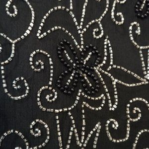Vintage Silver and black beaded top. Silk with rayon lining. Zips up the back. Floral beaded pattern. Scalloped detail along the sleeves and bottom.