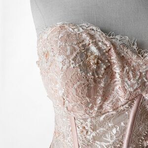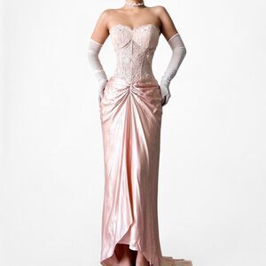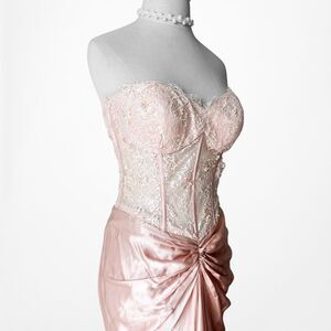 Y2K 2000s coquette fairy silk blend pink strapless fit flared maxi dress. Floral beaded on a corset bustier style semi sheer lace bodice. Back zip closure. Satin bottom with pleated detail. Padded