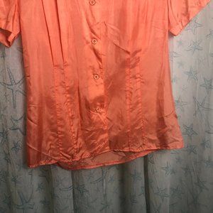 Vintage Silk Blouse the brand is Le Gang Montreal Canada made in Hong Kong....size Small ..see measurements for correct fit....Orange Peach short sleeve button front...approx 18"" pit to pit and 24" back length