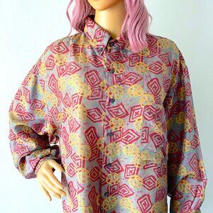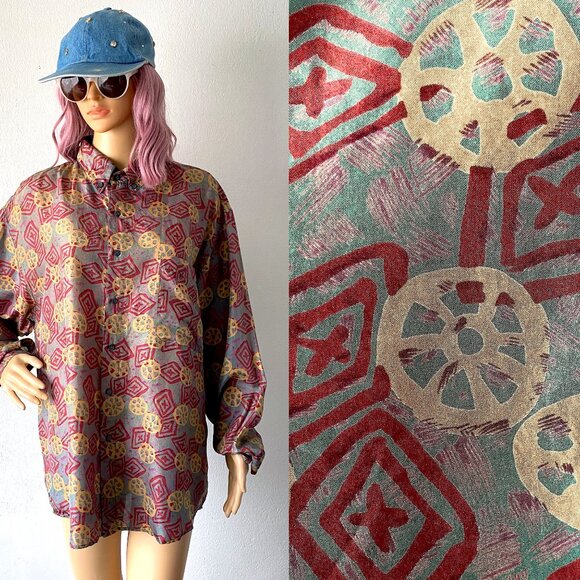 Vintage Silk Button Down Oversized Shirt Streetwear Bohemian Blouse Artsy Top L