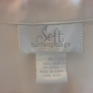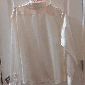 100 % silk blouse in a glowing shade of cream. Matching pearlized buttons and glamorous diagonal shirring under the bust line. Pristine condition, only worn once. By Soft Surroundings. Smoke-free and pet-free home. 25" from shoulder to hem, 22" pit to pit. Best fits women's sizes 14-16.