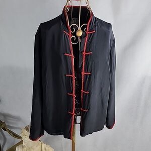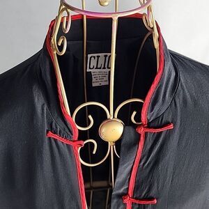 Vintage CLIO silk jacket with satin lining, frog & loop close, mandarin collar, black jacket trimmed in red