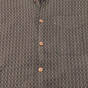 Vintage Silk Circa Black Geometric Button-Up. Elevate your casual collection with this sleek, vintage short-sleeve shirt! Luxurious 100% silk dark, versatile black color with an all-over geometric pattern AOP of wavy or zigzagging lines and small dots, adding subtle texture and visual interest. Classic button-down front, an open collar, and relaxed fit, channeling a 90s/Y2K retro vacation or streetwear