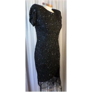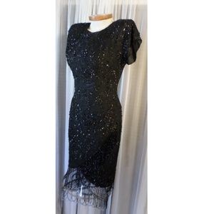 Vintage Stenay 8 Black Lady Silk Bead Sequin Dress M Woman Fringe Medium