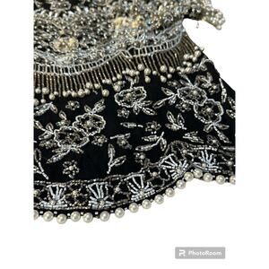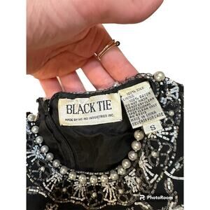 Black Tie by He-Ro Industries black embellished blouse, 100% silk with absolutely gorgeous pearl beading, sequins, and embroidery. Definitely a unique showstopper, statement piece! Intricate designs and in great, vintage condition. Shoulder pads and zip back. There are a couple of missing pears on the neckline (last photo), but overall in great condition.