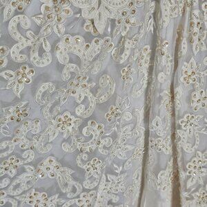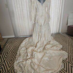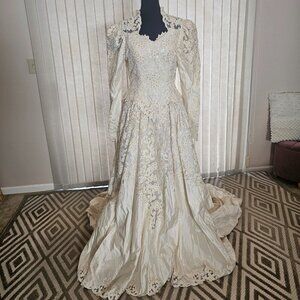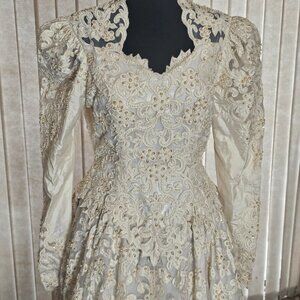 This vintage lace ivory wedding dress in size 12/14 (See measurements) exudes a classic Victorian style with intricate lace detailing, beading, and sequins.