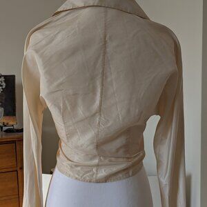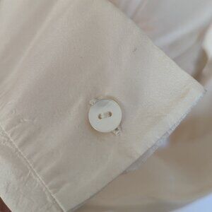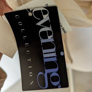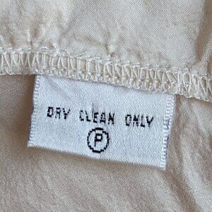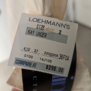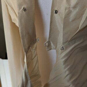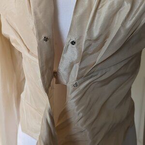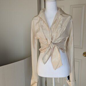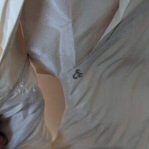 Gorgeous ivory/cream colored Kay Unger silk tie- front blouse - perfect for Black-tie events, vacation get-a-ways, or a night out! Pictures show the various closures in the front of the blouse, there are a few ways it closes. There is a hook that links through a thread- the thread needs to be re-formed into a loop (or you can replace hook & eye). There also is a snap. The blouse is very luxurious and has a bit of a ethereal shimmer because of the quality of the fabric. It appears a little darker in the main picture than it really is. Never worn. It's gorgeous! Original price (compared) was $298. Purchased at Loehmann's in the Black Tie/Designer section 20 years ago!