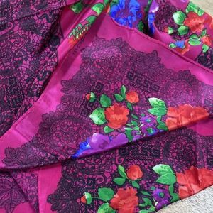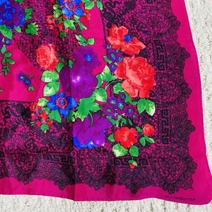 Vintage Silk Liz Claiborne Scarf a square shape with printed logo on one corner. This gorgeous fashion accessory is done in bold gem tone colors - berry pink and purples with a border of black lacey printed design, The floral design just pops in royal blues and greens with punches of pink and red - so pretty with a 1990's vibe. No materials tag but this feels like pure silk or possibly a silk blend with wonderful drape and soft feel. Gently worn - no flaws - just stunning!