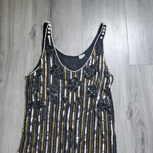 Vintage Silk Party Dress Flapper Whimsigoth Sequin Pearl Event Wedding Large black gold silver