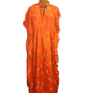 It is exquisite. Well maintained. 100 percent silk. 38 waist, 42 in pit to pit, almost 50 hip, 55 in length from to of shoulder to hem. Color is richer than in photos- more red than orange