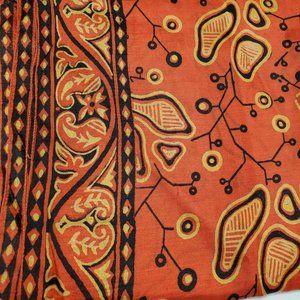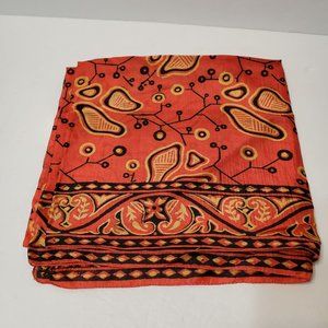 Stunning hand woven pure silk vintage scarf from India, in vibrant colors of red, orange, tan. Traditional block print geometric pattern with vine border. The scarf is in excellent condition, clean with no stains or wear issues - barely used. It measures about 36 inches square.
