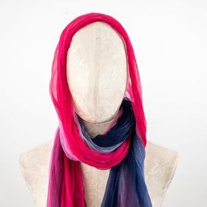 Vintage semi-sheer 100% silk chiffon scarf in gorgeous printed ombre pink & purple. Big rectangle wrap w tiny crinkled pleats give this bold accessory subtle texture. Wear it around neck, as a belt, wrap, sarong skirt, top - so many ways to style! EUC.