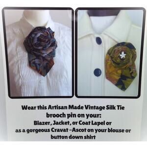 This hand crafted brooch features a vintage silk tie, transformed into a beautiful floral design made using a reclaimed Wembley silk tie and upcycled Mid Century button to create a one-of-a-kind accessory.