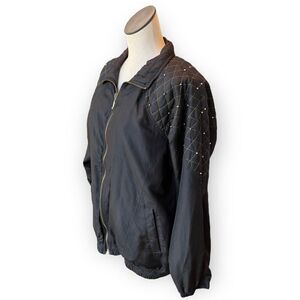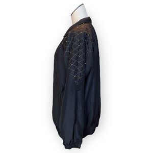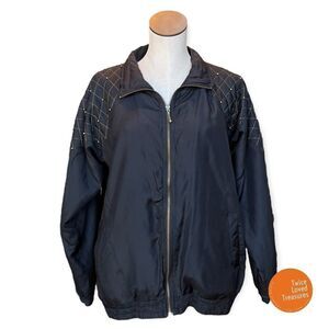 This jacket is in excellent vintage condition, no stains or one small run - black silk shell, nylon lining, and gold beads studding the shoulders in a quilted pattern.