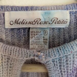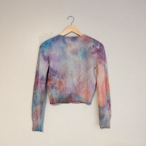 What an interesting statement piece for a whimsical wardrobe. Three little jewel buttons on the front create an unusual closure for a sweater. Very high quality materials used in making this. Feels like a cotton sweater, but a little fuzzier. Love the dye job on it. Fits like an XS.