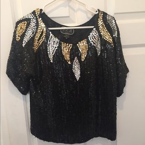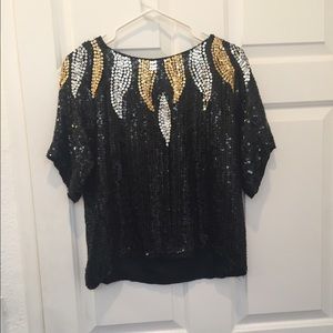 Selling a vintage silk and Sequin top which is fully lined and features black, silver, and gold detailing. CLOSET CLOSING 12/1. EVERYTHING MUST GO. NOW ACCEPTING OFFERS.