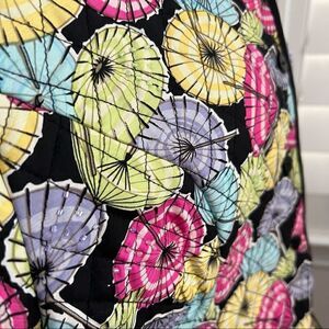 Soft and lightweight silk in a colorful umbrella print. Quilted Design. Lined. Button Front. See close up pic for seed beads. Great preowned condition- no flaws or signs of wear.